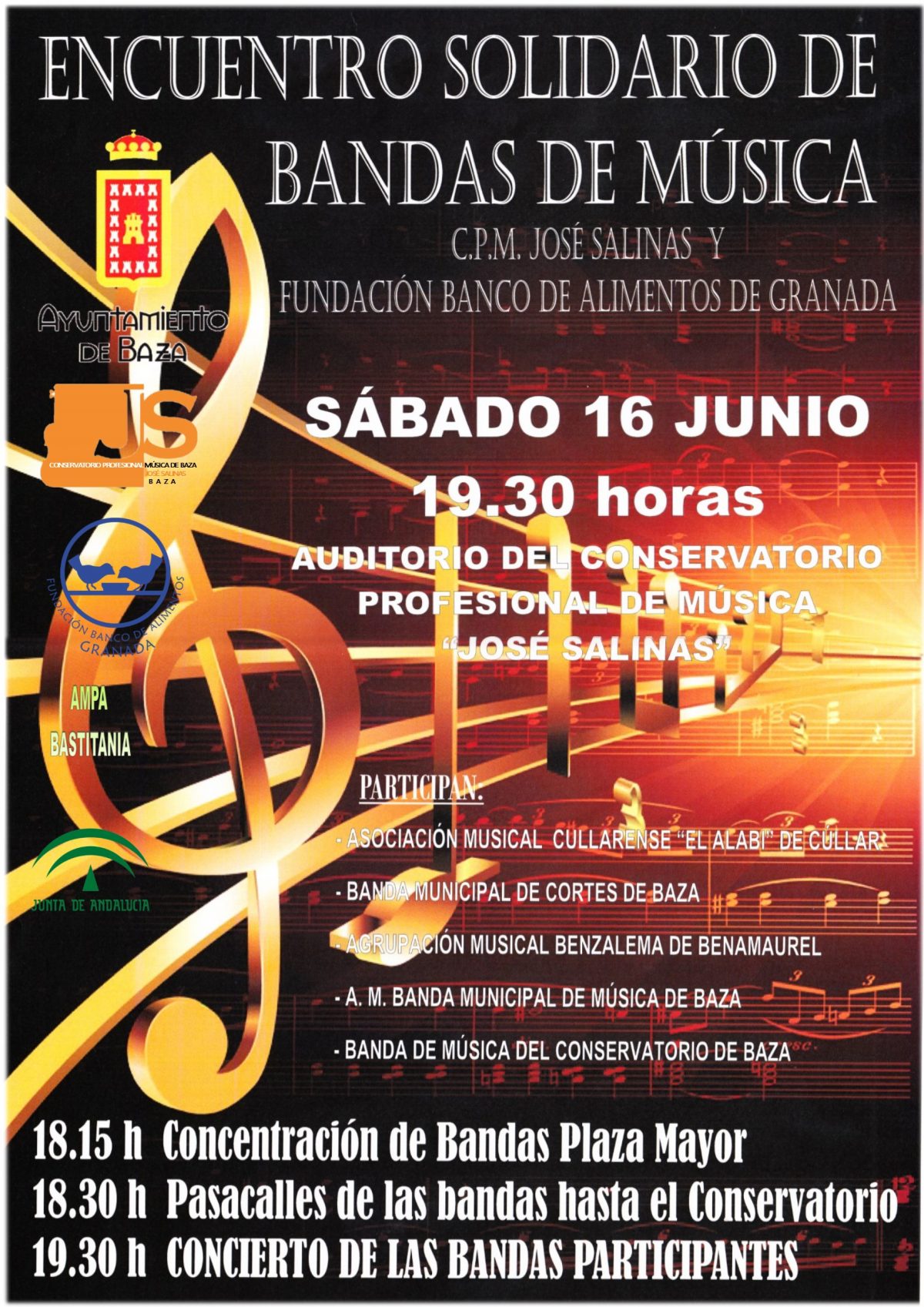 El próximo sábado 16 de junio el CPM «José Salinas» se celebra en nuestro centro el I Encuentro de Bandas de Música. Un acto en colaboración con la Fundación del Banco de Alimentos de Granada para fomentar la solidaridad con los mas desfavorecidos y promocionar la música en la comarca de Baza.