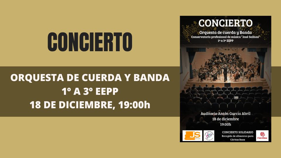 El miércoles 18 de diciembre a las 19:00h tendremos un fantástico Concierto Solidario a cargo de la Orquesta y la Banda de 1º a 3º de EEPP en el que colaboraremos con Cáritas Baza con una recogida de alimentos para los más necesitados de nuestra ciudad.