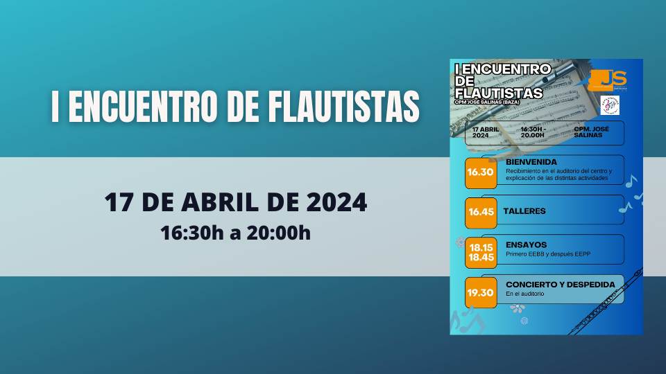 El miércoles 17 abril de 2024 desde las 16:30h hasta las 20:00h tendremos el I Encuentro de flautistas del Conservatorio de Baza, con talleres, sorpresas y un concierto final al que estáis todos invitados, ¡no os lo perdáis!