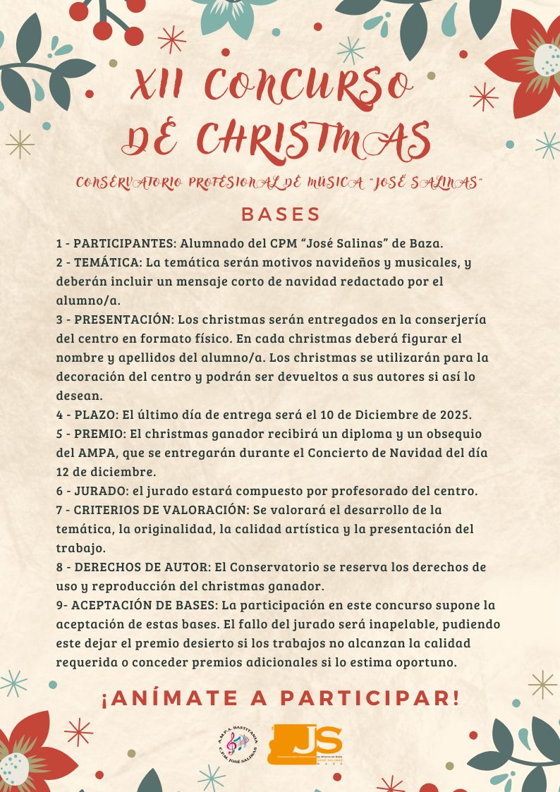 El Conservatorio Profesional de Música “José Salinas”, junto con el AMPA Bastitania, convoca el XII Concurso de Christmas, dirigido a todo el alumnado del centro.