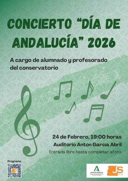 El próximo martes 24 de febrero a las 19:00h, celebraremos el Día de Andalucía con un concierto en el Auditorio “Antón García Abril” del Conservatorio a cargo de alumnado y profesorado del centro, en el que podremos disfrutar de un variado repertorio con obras de compositores andaluces y piezas de inspiración andaluza.